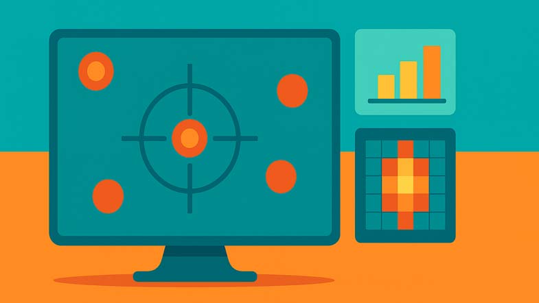 - Hit heatmapa: kde byly cíle nejčastěji zasaženy. Studené rohy naznačují slabé pokrytí; koncentrace ve středu může značit „tunelové vidění“.