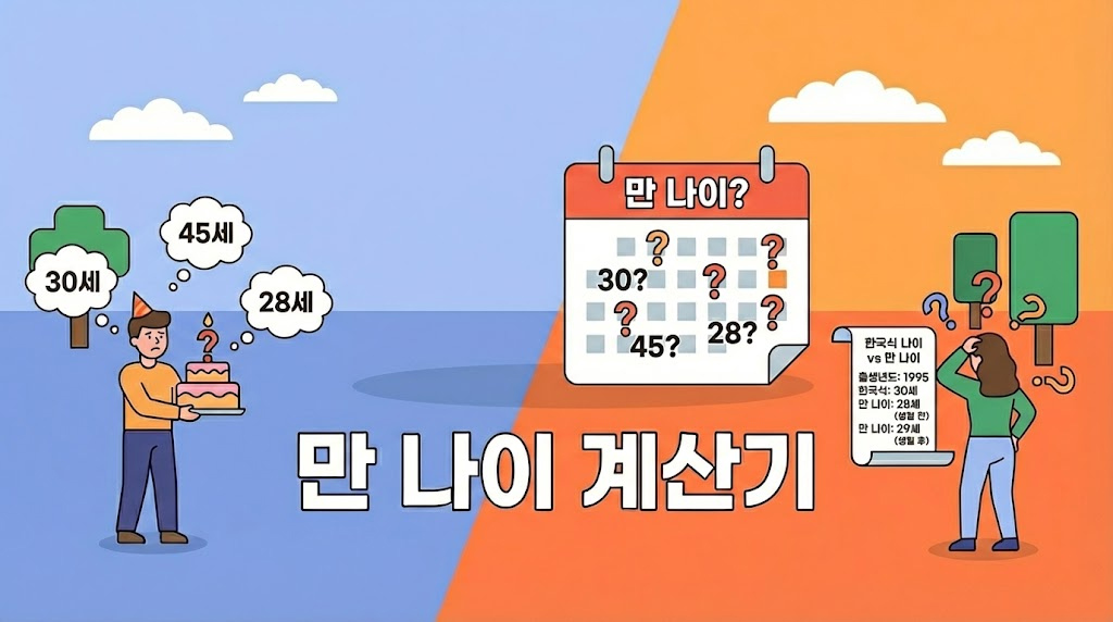 이 만 나이 계산기는 생년월일만 입력하면 현재 대한민국 표준인 만 나이는 물론, 아직 일상에서 혼용되는 세는 나이와 병역법 등에 쓰이는 연 나이까지 한 번에 계산해 드립니다. 2023년 6월부터 ‘만 나이 통일법’이 시행되었지만, 여전히 헷갈리는 나이 계산을 아래 도구로 명확하게 비교하고 확인해보세요.